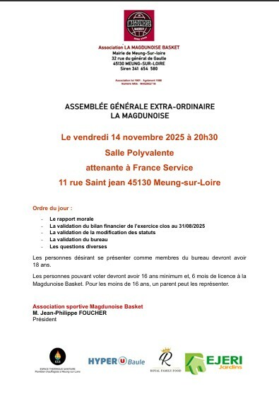 Assemblée Générale Extraordinaire - vendredi 14 Novembre 2025 à 20h30 - Salle polyvalente France Service - 11 Rue Saint-Jean, 45130 Meung-sur-Loire