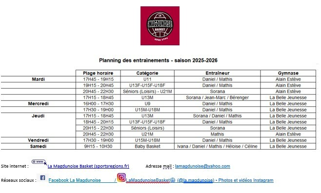 Vous trouverez ci-joint le planning définitif des entraînements pour la saison 2025/2026 à partir du mardi 16 septembre.