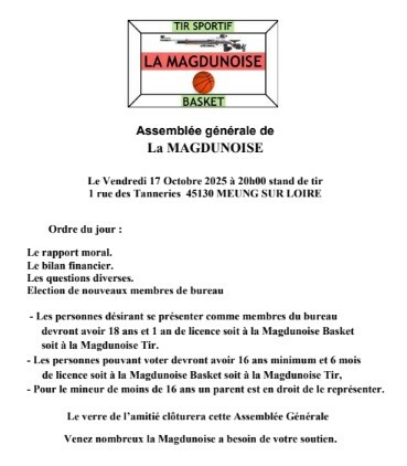 La Magdunoise (section Basket et Tir) organise son Assemblée Générale élective le Vendredi 17 Octobre 2025 à 20h00 au stand de tir, 1 rue des Tanneries 45130 MEUNG SUR LOIRE. Venez nombreux, nous comptons sur votre présence.