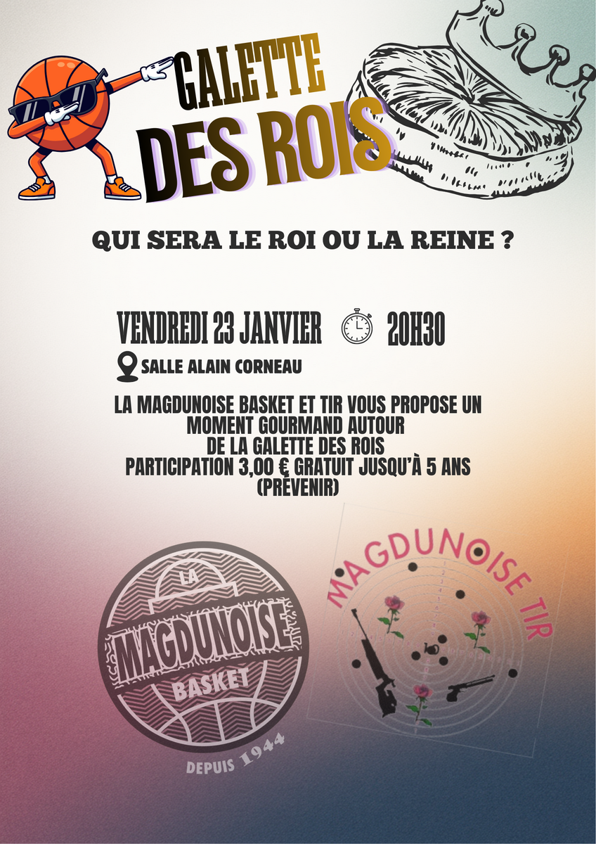 La Magdunoise (section Basket et Tir) vous invite à venir partager la galette le vendredi 23 janvier 2026 à 20H30 à la salle Alain Corneau de Meung sur Loire