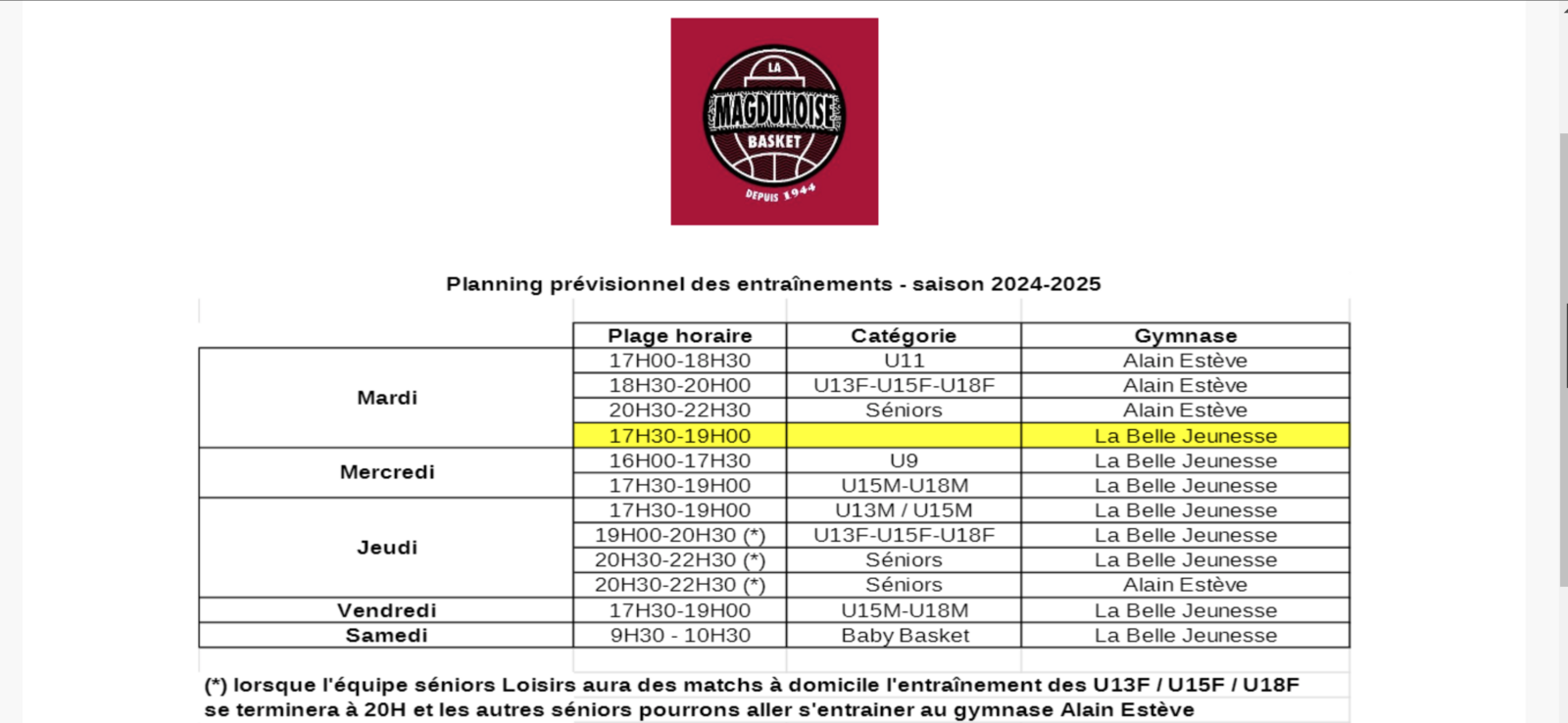 Planning des entrainements - saison 2024-2025